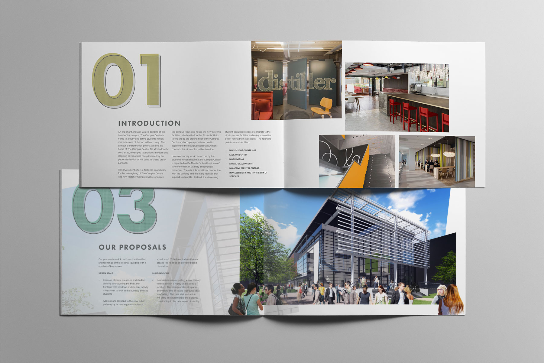Originally the company sent out a very standard A4 document that didn’t allow them to stand out from the competition. I created bespoke documents which complimented the design of the building and included all the information in a visually exciting way, to make CPMG’s proposals stand out from rest of the submissions.